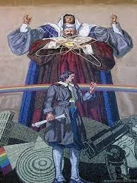 a giant mural hanging over the front lobby.