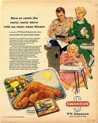 Actually, frozen dinners had been around for a while. But in the ’50’s, these marketing geniuses, sensing the "TV Culture" explosion, developed the concept of an all-in-one meal... that could easily be prepared and served in a “futuristic” compartmentalized, aluminum tray, with no dishes, no clean up… allowing more time to… WATCH TV!